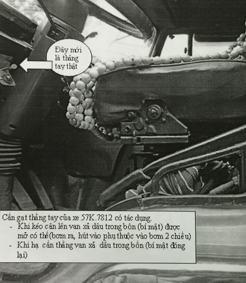 Riêng van xả được thiết kế bằng cần thắng tay đúng theo thiết kế xe, ngay cạnh ghế tài xế… Còn cần thắng thật được chế lại nằm dưới vô lăng. Tương tự, với xe bồn 57L-5556, bên trong hầm số 2 có một vách ngăn chắn sóng bằng kim loại; trên vách ngăn có 1 lỗ thông dầu (đường kính 8 cm) dẫn từ hầm này sang hầm bí mật, tại lỗ thông dầu có bộ phận đóng mở bí mật.