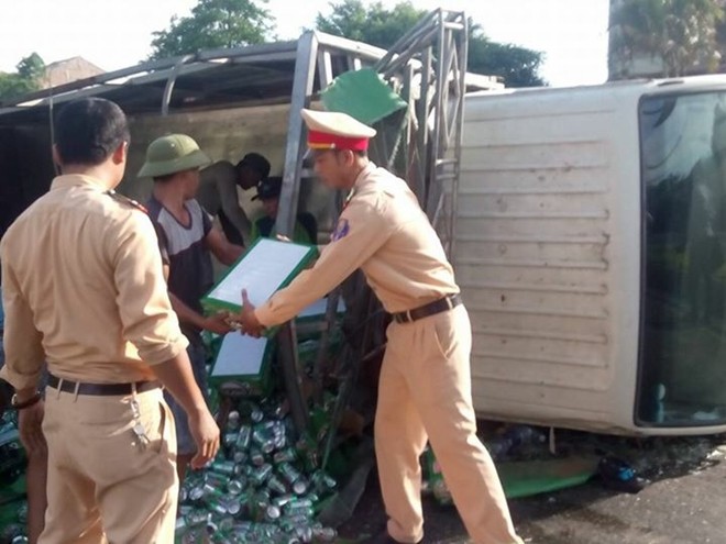 Theo Vnexpress, sự cố khiến bia trong thùng xe đổ ra lòng đường. Nhiều người qua lại khu vực này nhưng không có việc hôi của.