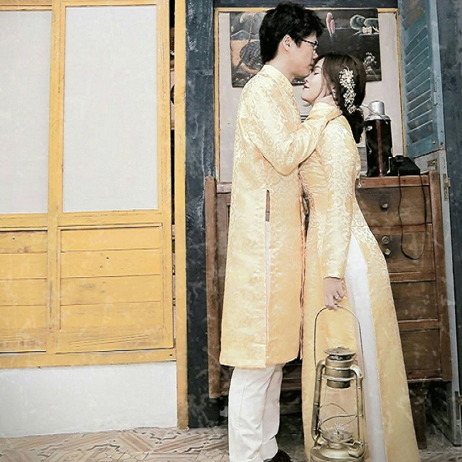 Thanh Trúc và chồng mặc áo dài Việt Nam. |