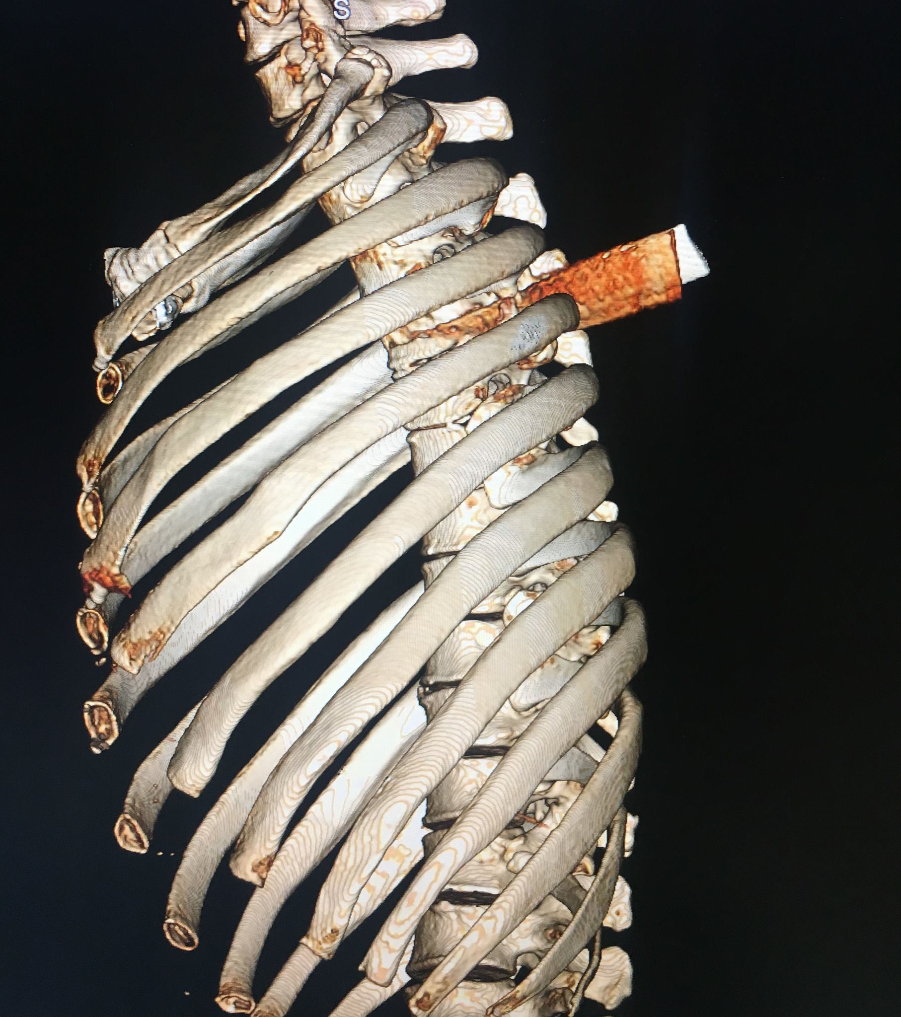 Bệnh nhân nam 43 tuổi nhập viện với lưỡi dao cắm sâu vào lưng, cạnh trái cột sống ngực, xuyên thấu ngực trái (cán dao đã gãy).