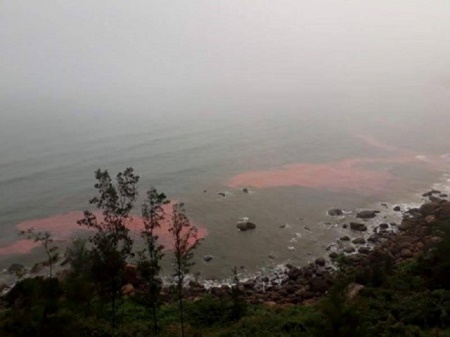 Dải nước màu đỏ liên tục xuất hiện tại ven biển Lăng Cô - Ảnh: báo Tri thức trực tuyến |