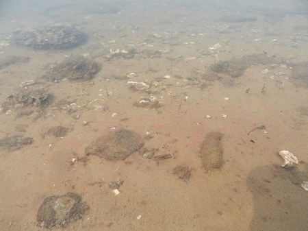 Anh Lê Công Thành (thợ lặn ở thôn An Cư Đông 2) cho biết lúc anh lặn xuống dưới vệt nước hồng thì thấy có chất lợn cợn.