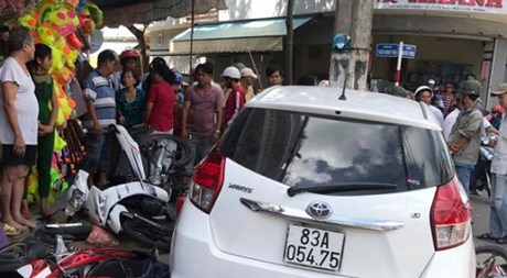 Chiều ngày 12/11, nhiều người đứng gần góc đường Hai Bà Trưng giáp Trần Minh Phú ở phường 1, (TP Sóc Trăng, tỉnh Sóc Trăng) đã bỏ chạy tán loạn khi thấy ôtô Toyota Yaris biển số 83A-054.75 lao nhanh lên vỉa hè. Hậu quả, 7 xe máy dựng trước một cửa hàng đồ chơi trẻ em bị ôtô tông trúng.