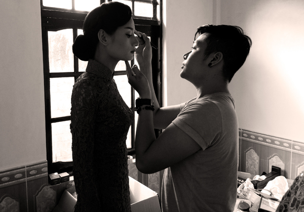 Từ sáng sớm, cô dâu Lê Thúy đã thức dậy từ sớm để chuẩn bị y phục, trang điểm. Trước thời khắc quan trọng, nữ người mẫu tỏ ra khá hồi hộp. |