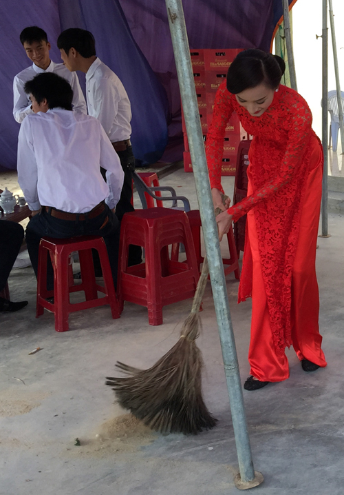 Cô dâu Lê Thúy diện áo dài đỏ thắm, cô tranh thủ quét sân vườn trước khi đến giờ lành đón khách. |