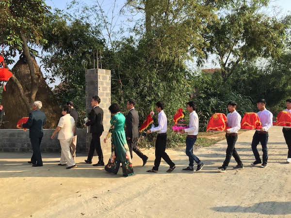 | Đúng 3h chiều, đoàn nhà trai bê sính lễ theo đúng phong tục truyền thống thẳng tiến đến nhà gái. |