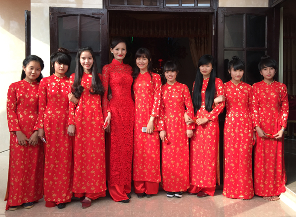 | Lê Thúy nổi bật giữa dàn bê tráp với áo dài ren đỏ, trang điểm chỉn chu, cuốn hút. Người đẹp rạng rỡ trong ngày vui của mình. |