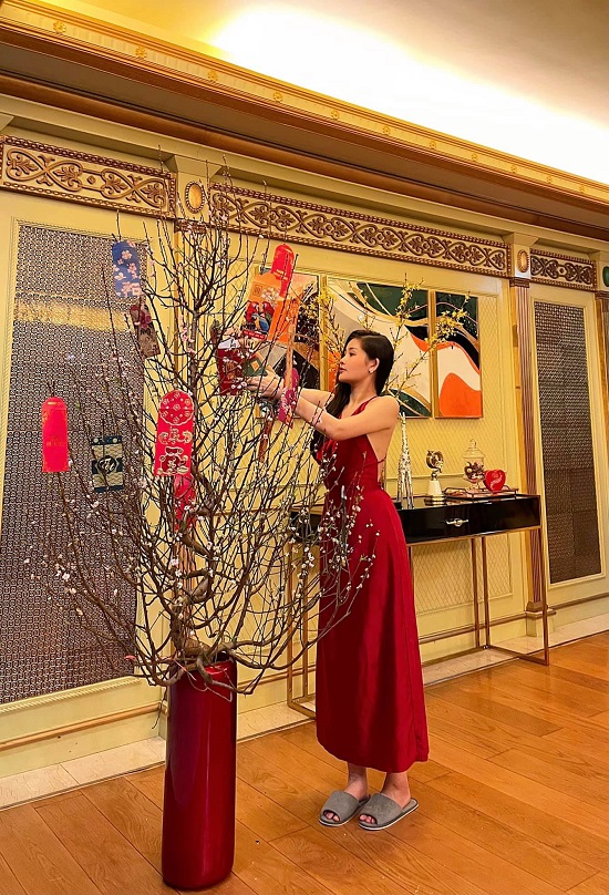 Nhiều chi tiết trong nhà nhìn như được dát vàng cho thấy sự kỳ công của chủ nhân. Đặc biệt, trong nhà có nhiều khu tiếp khách với phong cách đa dạng từ châu Á đến châu Âu. Người đẹp cũng tự tay trang hoàng nhà cửa với nhiều loại hoa rực rỡ. Cô còn dành riêng một góc trưng bày quà Tết trông khá nghệ thuật.