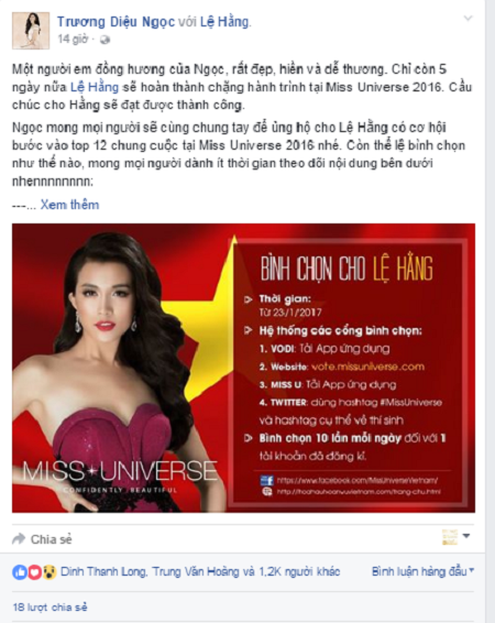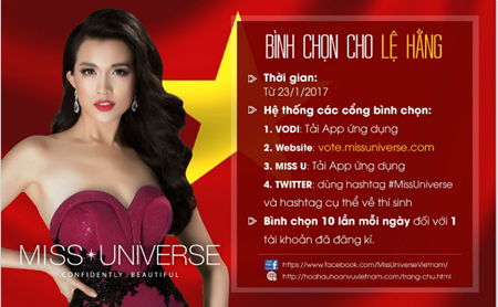 Hiện tại, chỉ còn hai ngày nữa là cuộc thi Miss Universe 2016 sẽ đi đến hành trình cuối cùng. Năm nay, ban tổ chức thay đổi thề lệ với top 12 được lựa chọn thay vì con số 15 quen thuộc như các mùa giải trước. Sau khi thông tin này được công bố, không ít đồng nghiệp, bạn bè và fan ruột của Á hậu Lệ Hằng không ngừng kêu gọi, chia sẻ cách thức bầu chọn thông qua các phương tiện truyền thông, mạng xã hội.