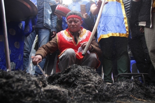 Sau khoảng thời gian thổi trên bếp với ngọn lửa bốc cao, các nồi cơm nhanh chóng được vùi kỹ vào đống rơm đang cháy để ủ cho đến lúc chín. |