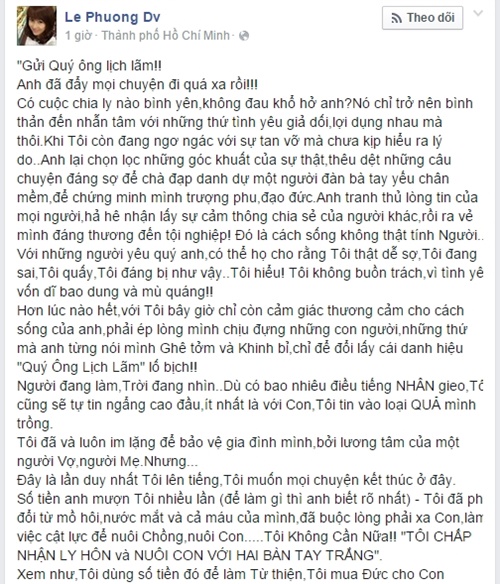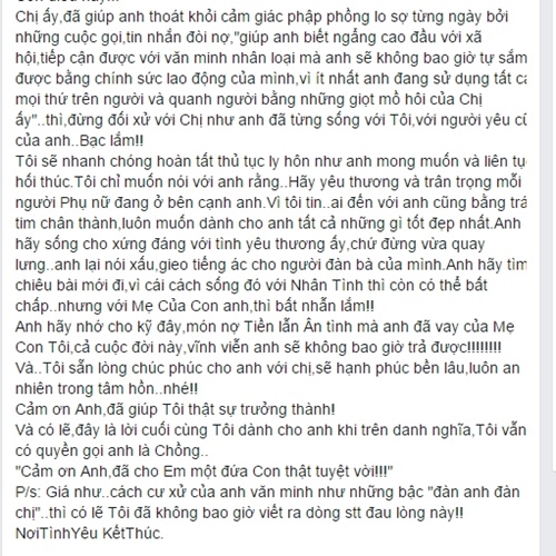 Tôi sẽ nhanh chóng hoàn tất thủ tục ly hôn như anh mong muốn và liên tục hối thúc. Tôi chỉ muốn nói với anh rằng hãy yêu thương và trân trọng mỗi người phụ nữ đang ở bên cạnh anh. Vì tôi tin ai đến với anh cũng bằng trái tim chân thành, luôn muốn dành cho anh tất cả những gì tốt đẹp nhất. Anh hãy sống cho xứng đáng với tình yêu thương ấy, chứ đừng vừa quay lưng anh lại nói xấu, gieo tiếng ác cho người đàn bà của mình. Anh hãy tìm chiêu bài mới đi, vì cái cách sống đó với nhân tình thì còn có thể bất chấp nhưng với mẹ của con anh, thì bất nhẫn lắm!!