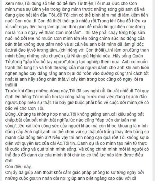 Xem như, tôi dùng số tiền đó để làm từ thiện, tôi mua Đức cho con mình, mua sự bình yên trong lòng mình trước những sóng gió anh đã và đang gieo hết lên đầu tôi để tôi còn có thể bình tâm mà đi làm, kiếm tiền nuôi con nữa..!! Con đã thiệt thòi quá nhiều rồi. Trong khi cha đồ hiệu xa xỉ, suốt ngày tiệc tùng ,làm gì còn thời gian để nhắn tin gọi điện chứ đừng nói là "cứ 5 ngày về thăm con một lần"...thì mẹ phải chạy từng hộp sữa nuôi nó, bởi mẹ nó muốn con mình lớn lên bằng chính sức lao động của bản thân, không dựa dẫm nhờ vả ai cả. Nếu anh biết mình đã làm gì độc ác, trái đạo lý, vô lương tâm (chỉ riêng với con thôi!!) thì làm ơn,đừng thanh minh bằng những câu chuyện giả Nhân giả Nghĩa nữa. Hãy sống Quân Tử, đừng "gắp lửa bỏ tay người", đừng tạo nghiệp thêm nữa. Anh có muốn tranh thủ lòng tin và tình thương của mọi người dành cho anh khi anh luôn nghẹn ngào cay đắng rằng, anh bị ai đó "dồn vào đường cùng", thì cách tốt nhất là anh hãy sống chân thật, vì cây kim trong bọc cũng có ngày lòi ra thôi!!!!