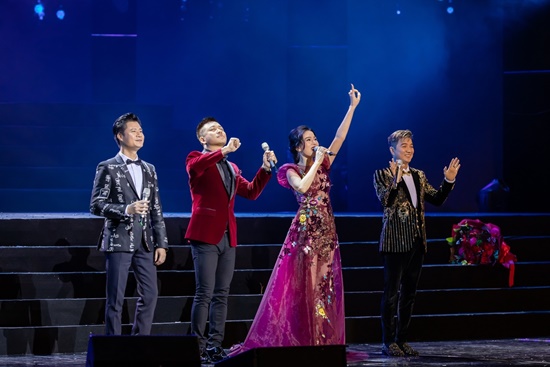 | Lệ Quyên cũng có bài hát tứ ca cùng ba khách mời của mình, đây là điểm nhấn đáng chú ý của live concert. Hiếm có khi nào những giọng ca đình đám cùng thể hiện một tác phẩm như đêm nhạc này. |