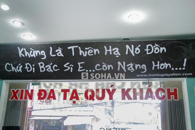 Ngay trước cửa quán, Lệ Rơi treo hướng dẫn: "Đạp cửa xông vào! Không dùng tay đẩy!". |