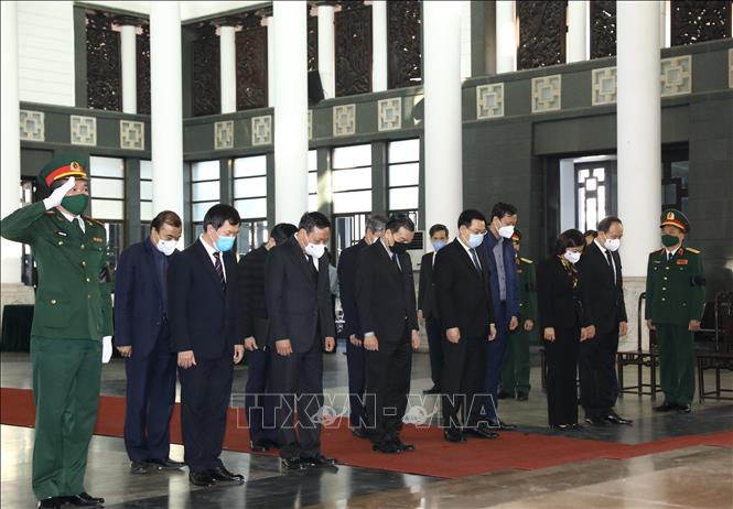 Đoàn đại biểu Thành ủy, HĐND, UBND, Ủy ban MTTQ Việt Nam thành phố Hà Nội do đồng chí Vương Đình Huệ, Ủy viên Bộ Chính trị, Bí thư Thành ủy, Trưởng đoàn đại biểu Quốc hội thành phố Hà Nội, dẫn đầu viếng nguyên Phó Thủ tướng Trương Vĩnh Trọng. Ảnh: Văn Điệp/TTXVN |