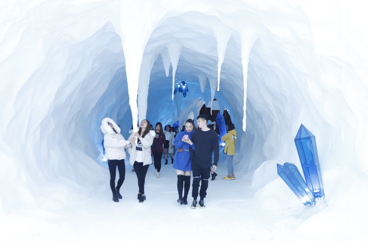 Đi qua đường hầm băng giá dài 50m, cảm giác như đang lạc ở Bắc cực xa xôi ngay giữa trời Fansipan thật thú vị. Sắc trắng của những nhũ băng tuyết rủ xuống, sắc xanh của những khối màu pha lê thi thoảng bật lên trên nền trắng xóa của đường hầm, tựa hồ như khi đang đi giữa hầm băng bí ẩn và phát hiện một khối kim cương khổng lồ, vô cùng thú vị. Và khi những bông tuyết rơi trong đường hầm, cảm giác ngỡ ngàng thích thú ấy thậm chí còn còn vỡ òa hơn thế nữa. Khung cảnh Bắc cực này chắc chắn sẽ tốn rất nhiều dung lượng bộ nhớ trong máy ảnh hoặc điện thoại của bạn.