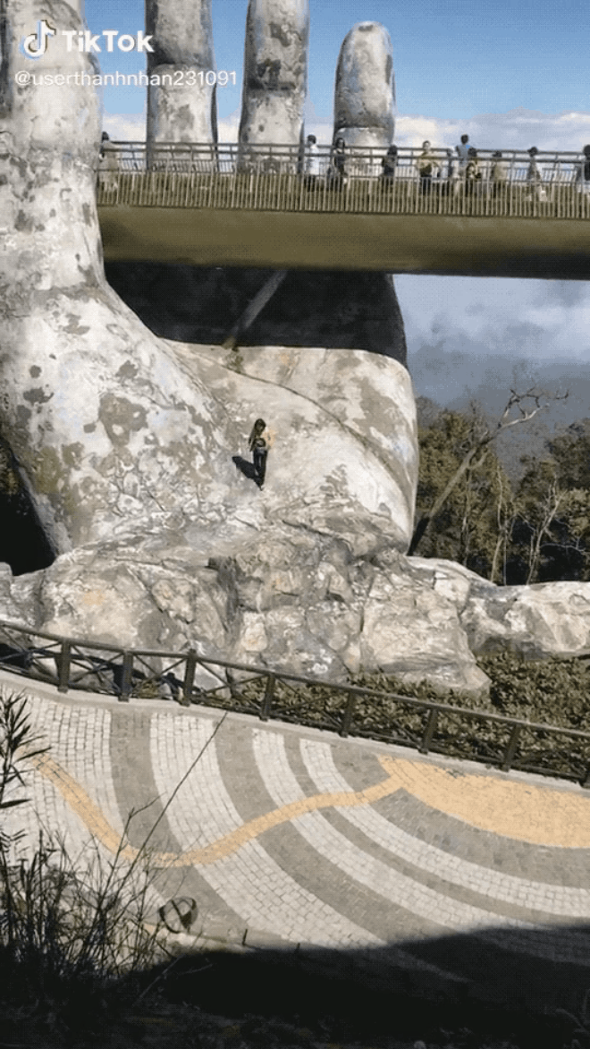 Nữ du khách bất chấp nguy hiểm xuống lòng bàn tay ở Cầu Vàng. (Nguồn: TikTok) |