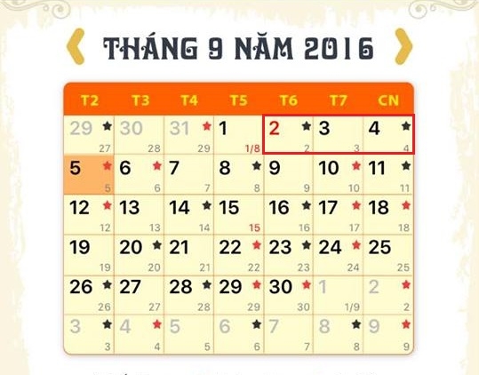 Tin tức từ VnExpress, theo lịch nghỉ lễ, Tết năm 2016 của Bộ Lao động, thương binh và xã hội, dịp Quốc khánh năm nay người lao động sẽ được nghỉ 3 ngày, gồm thứ sáu 2/9 và hai ngày cuối tuần (ngày 3 và 4/9).