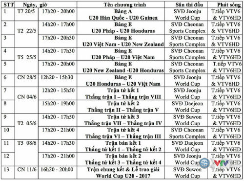 - 18h00 ngày 22/5: U20 Việt Nam vs U20 New Zealand (VTV6 & VTV6 HD)