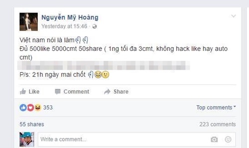 Các bạn nam thì "Đủ 60k like 15k share sẽ mặc quần lót nhảy xuống và uống hết một ca nước sông. Việt Nam nói là làm. Share mạnh nào đủ làm liền." Bạn nữ thì cũng "chịu chơi" không kém khi đem "sản phẩm tự nhiên" ra để câu like "Cầu like chơi nè: 7k like, 77 bình luận, 777 share thì mình sẽ không mặc gì chạy 7 vòng quanh trường Đại học Công nghệ Sài Gòn nha. Việt Nam nói là làm, ahihi", "100k like post clip quan hệ sắc nét...". Thậm chí còn có người còn chơi lầy vượt sức tưởng tượng (và cả sự chịu đựng) khi thách thức: "Việt Nam nói là làm!!! Đủ 30k like 10k chia sẻ N.L sẽ ăn một tô c**. Đúng 8h tối ngày mai nói là làm." hoặc "Đủ 30k like sẽ đổ c** từ trên đầu xuống rồi tắm c**"...