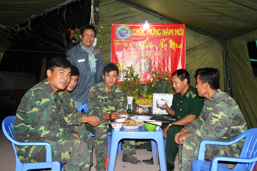Bên trong chiếc lều tạm, "gia tài" của những người lính đang bám trụ tại đây là vài cái nồi, 5 cái võng và một số can đựng nước sinh hoạt cá nhân. Mặc dù bận rộn với nhiệm vụ chống buôn lậu biên giới, song các anh vẫn cố gắng sắp xếp một góc nhỏ để đón giao thừa. Không khí Tết "chớm nở" qua câu chúc mừng năm mới, dĩa trái cây, nhành hoa. "Nhìn vào góc nhỏ ấy, các người lính xa quê chúng tôi cảm thấy ấm lòng khi xuân về", một chiến sĩ chia sẻ.