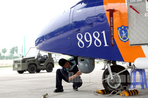 | Nhân viên kỹ thuật hàng không kiểm tra hệ thống rađa của máy bay tuần thám biển Casa-212. |