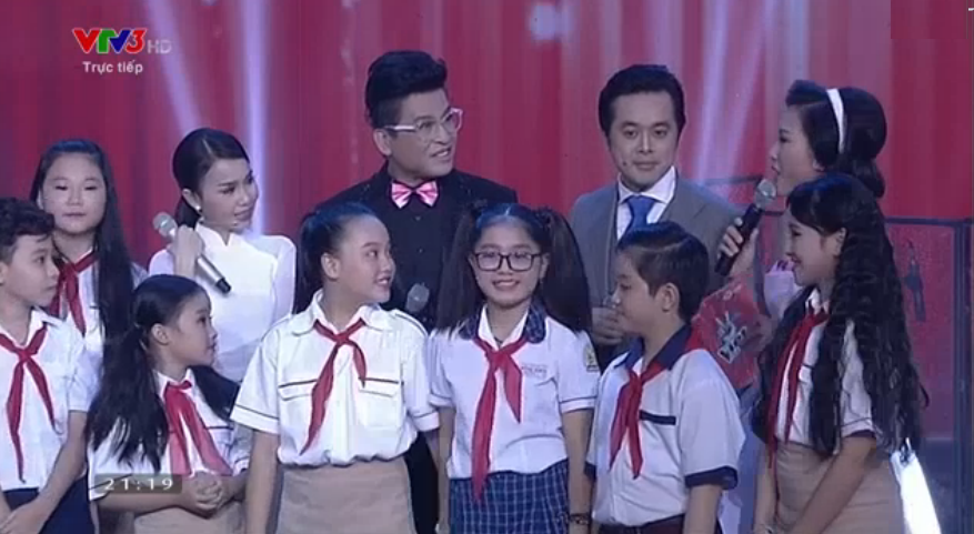 21h20: MC Thanh Bạch và Hoàng Oanh bước ra sân khấu và giới thiệu 9 thí sinh nhí sẽ tham gia biểu diễn trong đêm liveshow 1 Giọng hát Việt 2015.