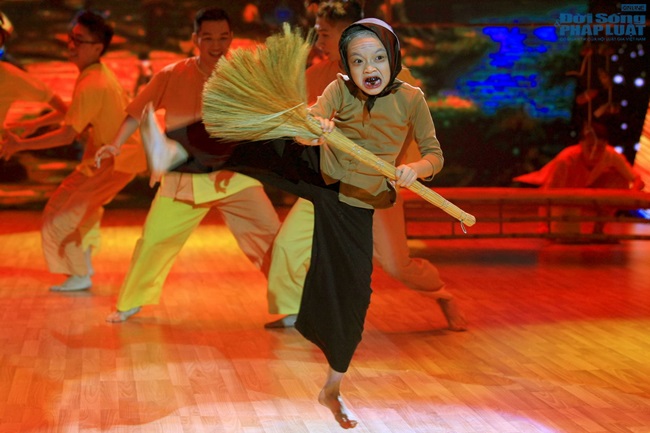 22h19: Bé Linh Hoa gây bất ngờ với tạo hình một bà lão lưng còng, tóc bạc thể hiện điệu nhảy Jive và Hiphop sôi động trên nền tác phẩm "Mừng Tuổi Mẹ , Beethoven Virus".