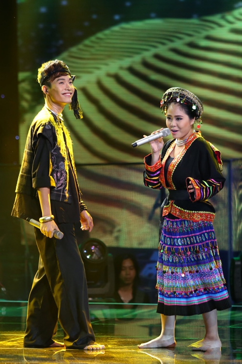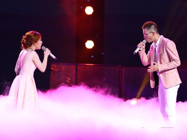 21h11: Tiết mục đầu tiên trong đêm thi cũng là màn kết hợp song ca đến được đội HLV Thu Phương, hai thí sinh Anh Duy và Kiều Anh thể hiện ca khúc "Tình yêu màu nắng" của nhạc sĩ Phạm Thanh Hà.