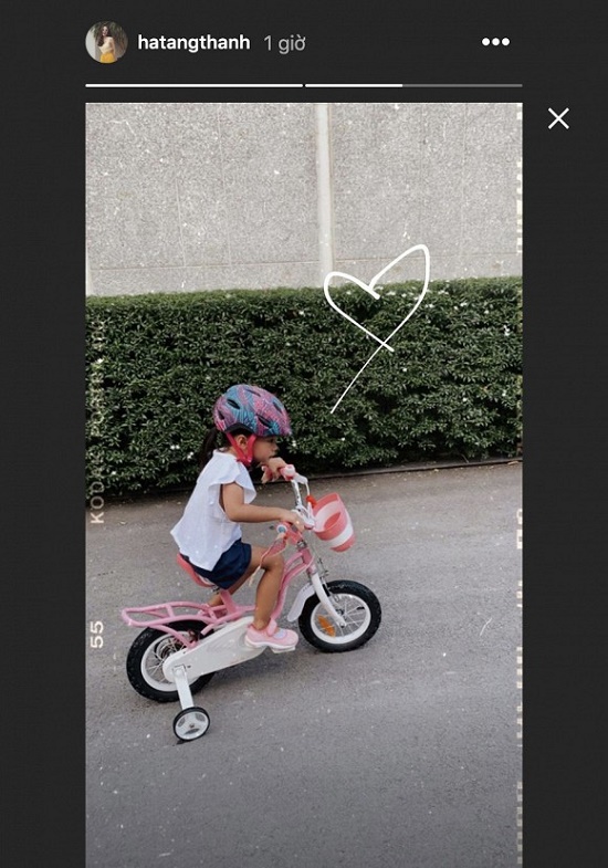 Tăng Thanh Hà chia sẻ khoảnh khắc con gái tập xe đạp. |