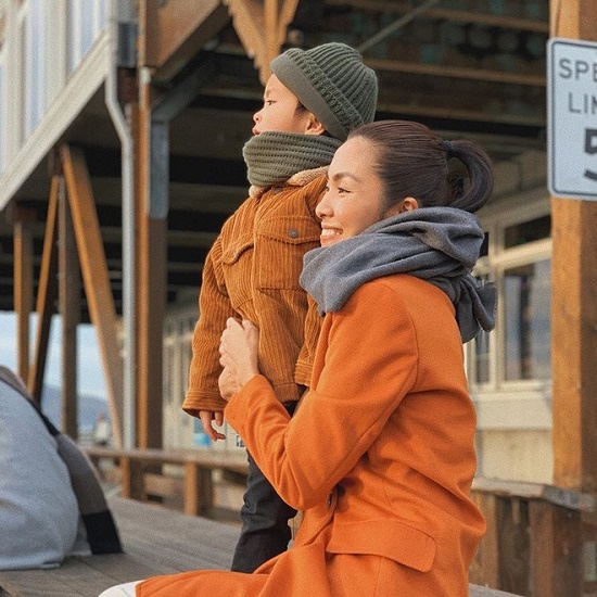 Hai mẹ con diện trang phục mùa đông đồng điệu, ấm áp. Dù chỉ là góc nghiêng nhưng cũng dễ dàng nhận thấy, quý tử nhà Hà Tăng có sống mũi cao và khuôn mặt thông minh, lanh lợi.