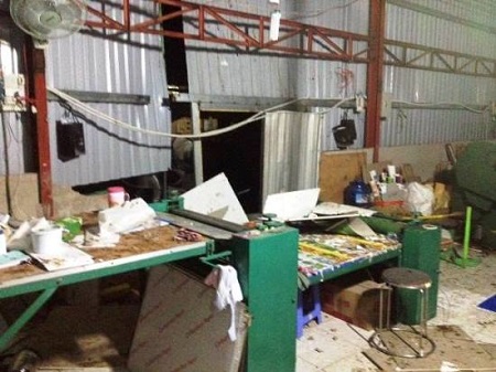 Chạy đến kiểm tra, mọi người phát hiện nhiều đồ đạc trong công ty văng tung toé, tường nhà đổ sập, trần nhà bị thổi bay. Ngôi nhà cấp 4 bên cạnh công ty cũng bị hư hỏng nặng, phần tường bị sập, lún.