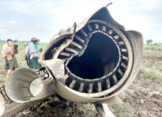 Một mảnh vỡ máy bay chiến đấu F-7 rơi ở Myanmar - Ảnh: EPA. |