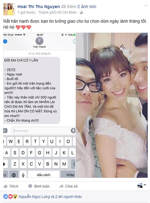 Ngoài ra, Trấn Thành cũng nhắn tin mời cưới cho bạn bè với nội dung khá hài hước. Theo chia sẻ của Hoa hậu Thu Hoài, nội dung tin nhắn mời đám cưới của Trấn Thành như sau: