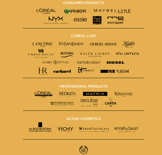 Theo báo cáo tài chính năm 2016 của L'Oréal, tập đoàn này có khoảng 89.300 nhân viên, sở hữu 34 thương hiệu, cùng sản phẩm có mặt tại khoảng 140 quốc gia trên thế giới tính đến cuối năm ngoái. Doanh thu năm 2016 của L'Oréal là 25,84 tỷ euro, lợi nhuận đạt 4,54 tỷ euro. L'Oréal hiện là công ty niêm yết lớn thứ 4 của Pháp.