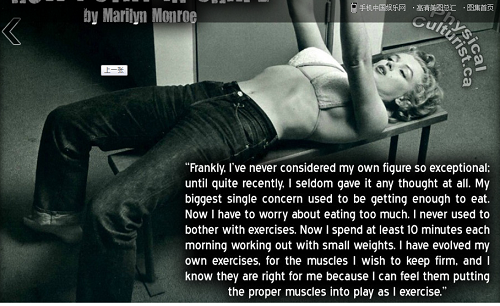 Marylin Monroe, cô đào điện ảnh Holywood là người rát coi trọng tập thể dục, cô tập gym, đạp xe… bởi nghề diễn viên quả thực rất cực nhọc và đòi hỏi sức khỏe tốt.
