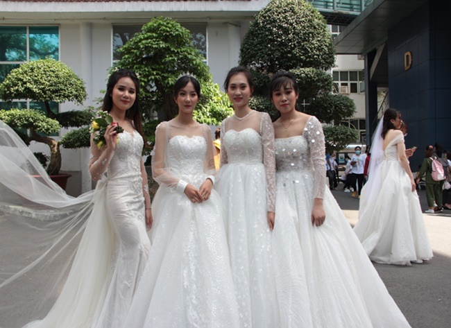 Không chỉ diện váy trắng, các cô gái còn trang điểm xinh đẹp, làm tóc, cầm hoa cưới. Nhiều người còn trêu đùa rằng có lẽ nhà trường đang "phát cô dâu" hoặc mở hội kén rể. |