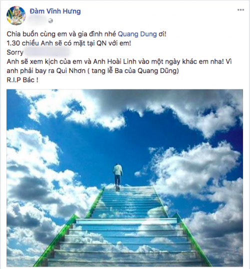 Quang Dũng cũng đã thay ảnh đại diện sang màu đen để thể hiện nỗi đau mất người thân khiến các đồng nghiệp nghệ sĩ cũng như người hâm mộ không khỏi xót xa. Bố của nam ca sĩ mất vào hồi 15 giờ 15 phút ngày 17/2, hưởng thọ 80 tuổi. Lễ an táng ông sẽ diễn ra vào lúc 8 giờ này 20/2 tại nghĩa trang Bùi Thị Xuân, Quy Nhơn.
