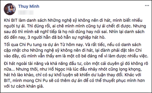 | MC Thùy Minh cho rằng nên liệt Chi Pu vào danh sách “Những nghệ sĩ không nên đi hát”. |