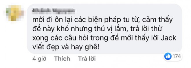 Nhiều người hâm mộ Jack thích thú với đề thi văn và bình luận: "Trong đề thi trường mình mà có câu này là khỏi sợ bị điểm kém", "Nếu lớp cháu ra thi bài này chắc cháu đc 10 điểm luôn", "Tiếc là đề này không có ra để thi, đề trường tui á", "Kiểu thầy giao đề là FC ý, nhưng không thể phủ nhận công lao anh tui"...