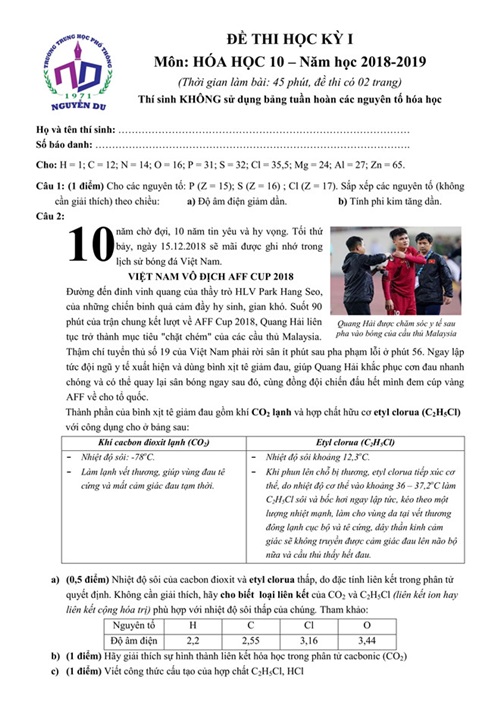 Đặc biệt, đề thi học kì 1 lớp 10 môn Hóa học cúa trường THPT Nguyễn Du (TP HCM) yêu cầu học sinh trả lời những câu hỏi liên quan đến thành phần bình xịt tê giảm đau giúp cầu thủ Quang Hải có thể nhanh chóng quay lại sân bóng trong trận chung kết lượt về AFF CUP 2018.