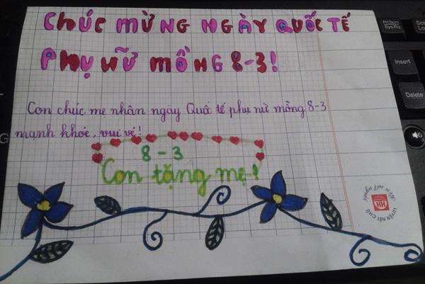 Mở mắt dậy, mẹ bật máy tính lên checkmail như mọi ngày thì đã thấy con gái Thảo Nguyên và con trai để thiệp chúc mừng mùng 8/3 mà 2 con tự làm từ lúc nào.