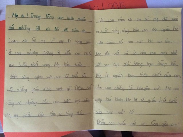 “Hôm nay nhận được quà của bạn í mà cảm thấy xúc động vô cùng. Có thể bạn í không tự viết ra được những dòng này nhưng mẹ rất trân trọng những tình cảm này của bạn dành cho mẹ, ít ra bạn í cũng đã biết quan tâm đến mẹ và biết chọn những câu từ khiến mẹ rất hài lòng".