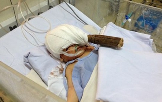 Bé sơ sinh cùng hung khí bị đâm vào đầu. |