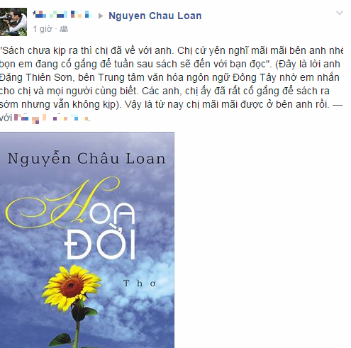 Nickname Vu Viet Tuan bình luận: “Sách chưa kịp ra thì chị đã về với anh. Chị cứ yên nghỉ mãi mãi bên anh nhé, bọn em đang cố gắng để tuần sau sách sẽ đến với bạn đọc". (Đây là lời anh Đặng Thiên Sơn, bên Trung tâm văn hóa ngôn ngữ Đông Tây nhờ em nhắn cho chị và mọi người cùng biết. Các anh, chị ấy đã rất cố gắng để sách ra sớm nhưng vẫn không kịp). Vậy là từ nay chị mãi mãi được ở bên anh rồi”.