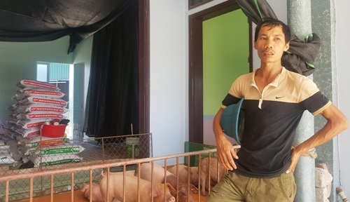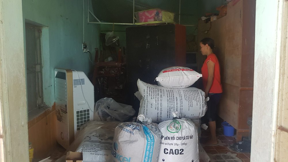 Hiện tại, hai căn buồng trước là phòng ngủ được trải lớp trấu dày để thả gà. Hiên nhà trông ra khoảng sân có cây nhãn xanh mướt là chỗ nuôi khoảng 20 con lợn, ước chừng vài chục kg/con. Phòng khách rộng hơn chục m2 chất đầy bao tải chứa thức ăn chăn nuôi, phân đạm…