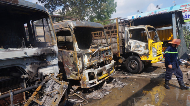 3 xe tải đậu phía trước kho phế liệu bị cháy rụi. (Ảnh: Thạnh Niên) |