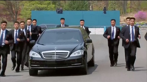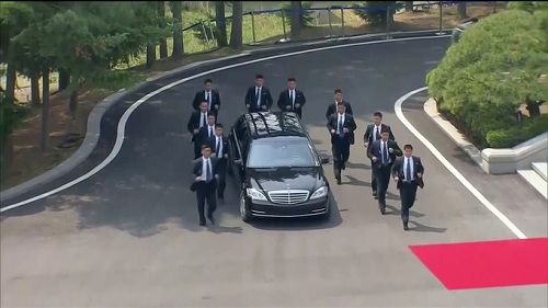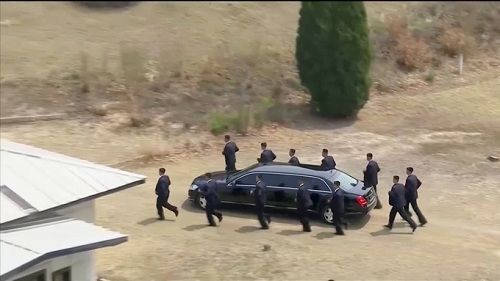 Sau khi phiên họp bàn buổi sáng kết thúc, lãnh đạo Triều Tiên Kim Jong-un đã ngồi trên chiếc xe Mercedes-Benz màu đen được 12 vệ sĩ bảo vệ để quay trở lại biên giới nước này dùng bữa trưa.