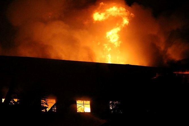 Ngọn lửa bao trùm cả công ty gỗ. Ảnh: Tiền Phong |