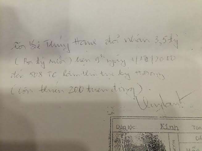 | Anh C cung cấp giấy xác nhận đã nhận 3,5 tỉ đồng do chị Lê Thúy Hạnh viết. |